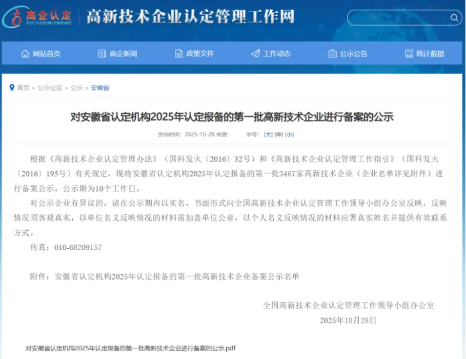 近日,安徽省工业和信息化厅、省财政厅和国家税务总局安徽省税务局联合公布了2025年度高新技术企业认定名单,安徽星河云创数字科技有限公司凭借卓越的科技创新能力、完善的知识产权体系以及高成长性的发展态势,成功通过国家相关部门联合评审认定,荣获2025年“国家高新技术企业”称号。